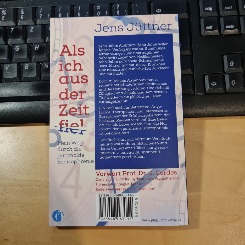 Heute anstatt einer ausführlichen Rezension mal ein kurzer Buchtipp von mir: „Als ich aus der Zeit fiel – Mein Weg durch die paranoide Schizophrenie“ von Jens Jüttner ist eine gelungene Mischung aus Schilderungen persönlicher Erlebnisse und Aufklärung über die Erkrankung. Sehr interessant fand ich vor allem die ebenfalls eingebrachte Perspektive der Angehörigen.