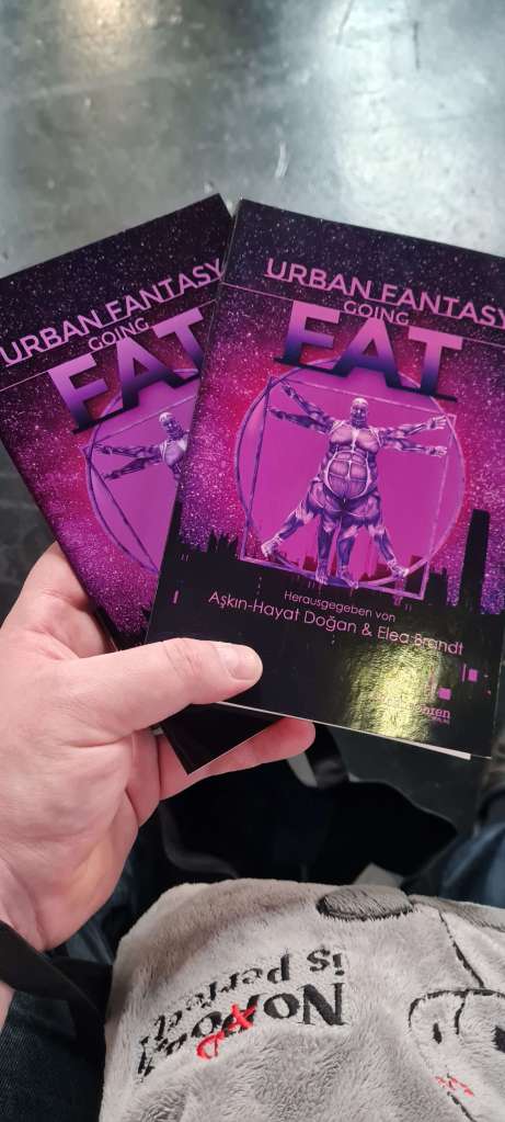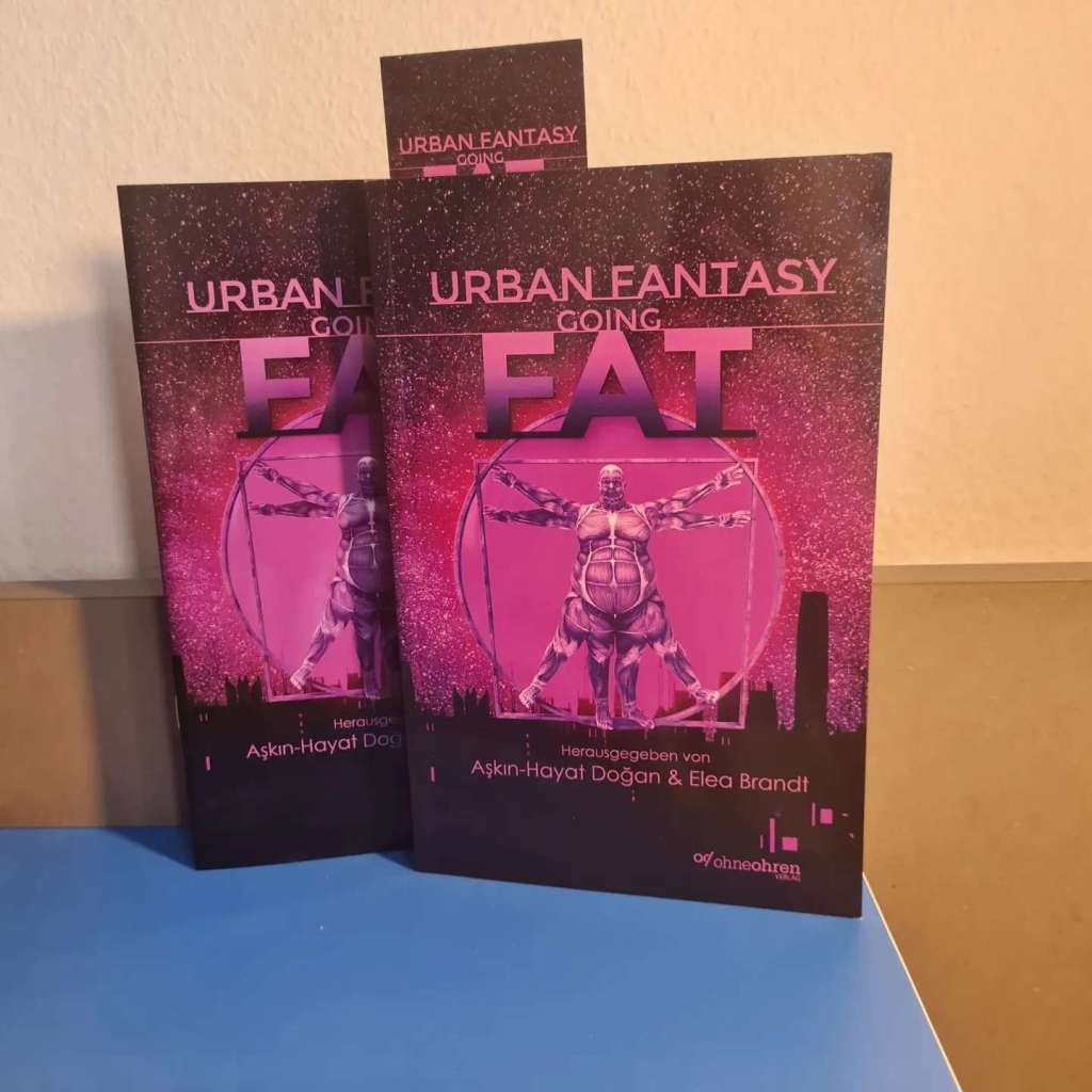 Beim Verlag ohneohren gab es für ein freundliches Lächeln nicht nur ein tolles Buch – die Anthologie Urban Fantasy going FAT, herausgegeben von Aşkın-Hayat Doğan & Elea Brandt – mit dem ich ohnehin schon länger geliebäugelt hatte, sondern ich bekam noch einige Goodies: Bonusmaterial zum Buch in Form einer weiteren Kurzgeschichte, ein Lesezeichen und sogar noch einen Beutel zum Tragen, obwohl ich mit Rucksack und zwei Beuteln eigentlich gut ausgestattet war.