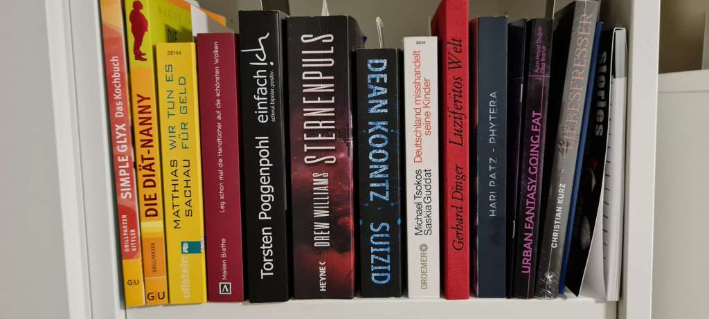 Um die neuen Bücher ins Regal zu stopfen, musste ich leider einen Fitzek rauswerfen. Der zieht jetzt um in meine Hauptwohnung und wartet darauf, mit der nächsten Bücherkiste verschenkt zu werden.
